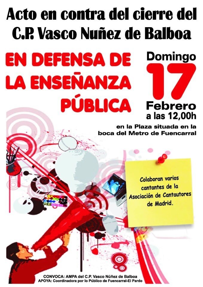 El AMPA del C.P. Vasco Núñez de Balboa ha convocado un acto junto con la sociedad de cantautores de Madrid el día 17 de febrero a las 12h en la plaza del metro Fuencarral donde terminará la campaña de recogida de firmas para su posterior entrega en la Dirección de Área Territorial de la Consejería de Educación de Madrid