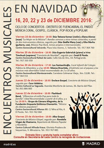Continuando con la programación navideña de años anteriores, la música vuelve a ser una de las protagonistas de las actividades culturales del distrito en estas fechas. Los centros culturales de Fuencarral-El Pardo acogen toda una selección de conciertos gratuitos y para todos los públicos.